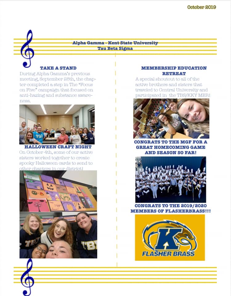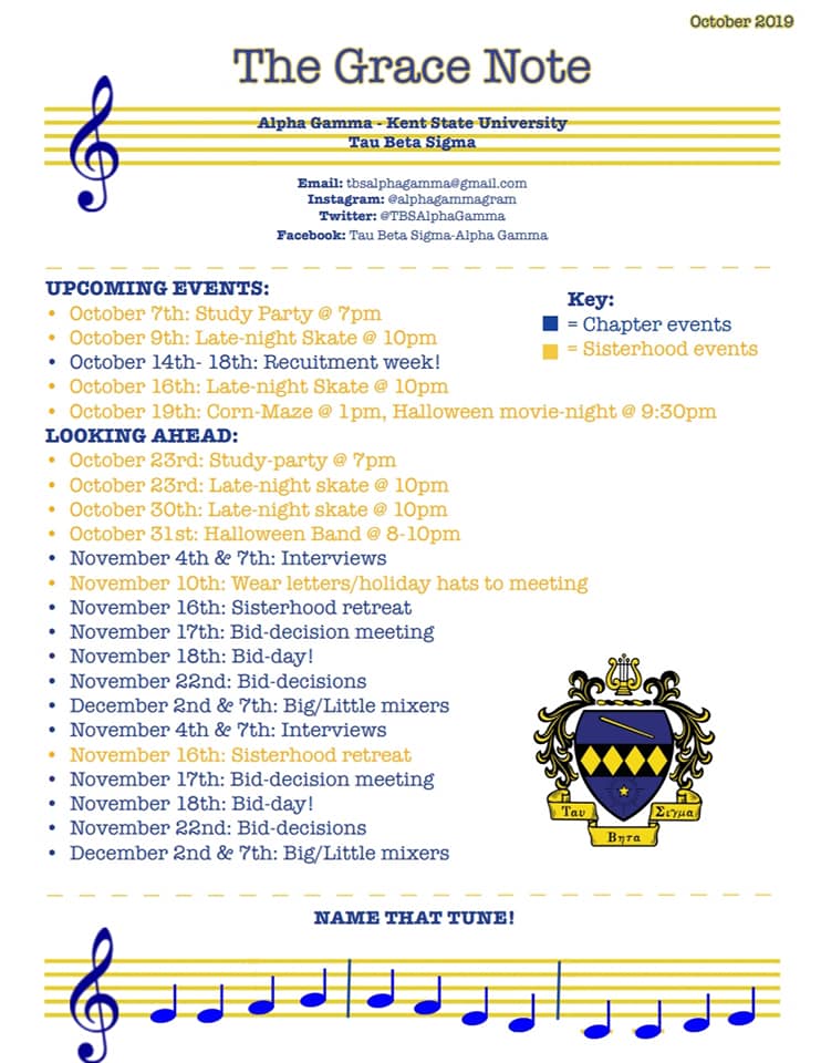 The Grace Note is the monthly newsletter that Alpha Gamma created!! This is just one of the things our communications committee chair Madeline Chester and her committee have worked on so far this month! You can see important dates, fun pictures, events we have gone too, and some athletic band highlights! Take a look at the photos below and be on the look out for next months Grace Note!